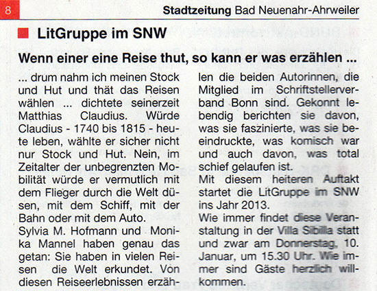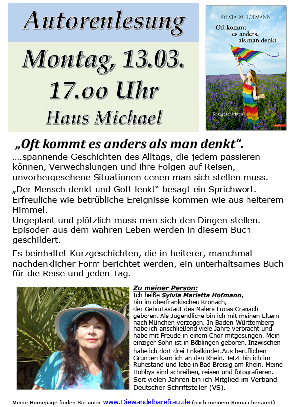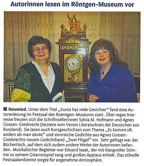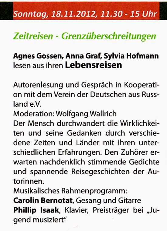 Die Autoren aus dem Verband Deutscher Schriftsteller (VS), Agnes Gossen-Giesbrecht und Sylvia Hofmann, lasen Reisegeschichten und nachdenkliche Gedichte. Neue Bücher wurden vorgestellt. Die in Russland geborene Anna Graf stellte sich zum ersten Mal dem Publikum mit einer Migrantengeschichte vor.
