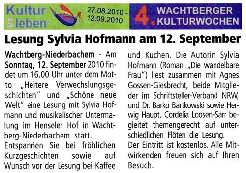 Wachtberg-Niederbachem – Im Rahmen der Wachtberger Kulturwochen hatte die Schriftstellerin Sylvia Hofmann gemeinsam mit den Autoren Agnes Gossen-Giesbrecht, Dr. Barko Bartkowski und Herwig Haupt zu einer Lesung in den Henseler Hof nach Niederbachem eingeladen.